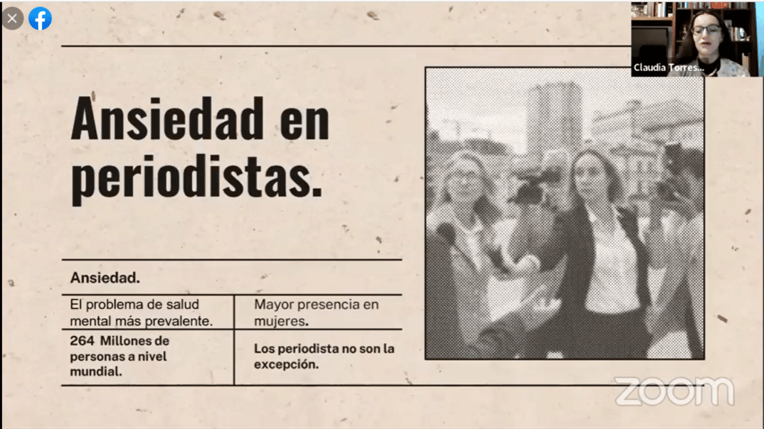 Torres inició su intervención diciendo que a partir de la pandemia, las patologías relacionadas con la salud mental se agudizaron debido a la alta exposición de situaciones que provocan ansiedad. Este es el problema más común en el mundo, y la mayor parte se muestra en mujeres. La Universidad de Toronto, contó la experta, realizó una investigación enfocada a periodistas donde el 70 % de participantes de la muestra presentaron síntomas de estrés: cambio de roles, inestabilidad emocional, exposición permanente, y el temor al contagio, han sido registrados como factores de riesgo altos. Torres presentó algunos testimonios sobre personas con registros de ansiedad como: ¡Estoy solo!, ¡Ya no duermo!, ¡Tengo ganas de llorar!, etc.