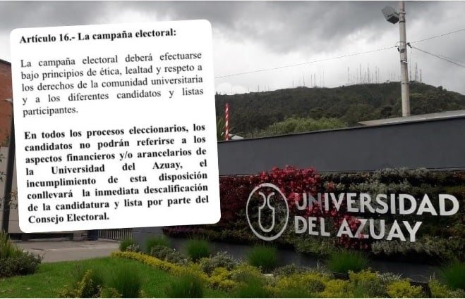 Ecuador 6 de enero de 2022. La Universidad de Azuay aprobó una reforma del artículo 16 del Reglamento de Elecciones de esta casa de estudios universitarios que dispone que “en todos los procesos eleccionarios, los candidatos no podrán referirse a los aspectos financieros y/o arancelarios de Universidad de Azuay”. Asimismo, se establece que el incumplimiento de esta disposición conlleva la inmediata descalificación de la candidatura y lista por parte del Consejo Electoral.